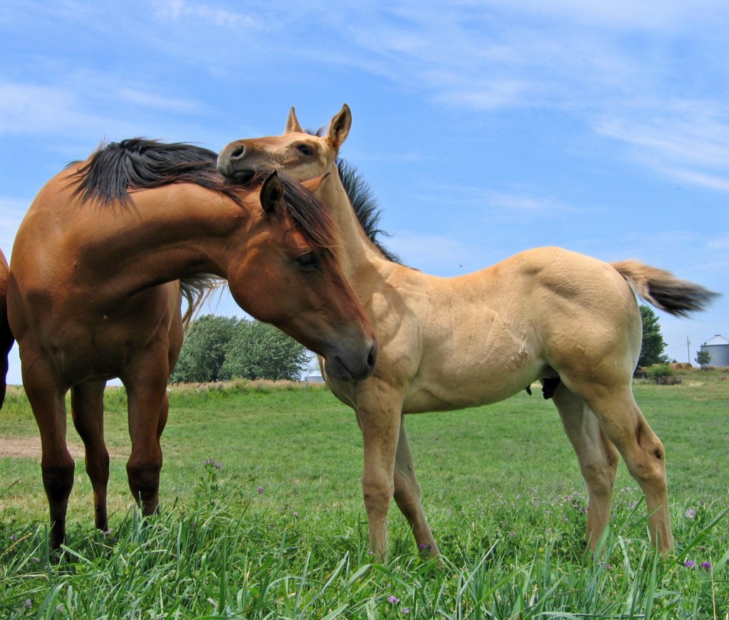 Materinska navezanost je pomembna že v prvih minutah po rojstvu žrebeta. Kaže se kot zaščitniško vedenje in strah, kadar je žrebe zunaj materinega dosega. Ko se žrebe trudi, da bi vstalo, kobila, ki še vedno leži, spremlja vsak njegov gib, ga opazuje in pomirljivo nežno zarezgeta, če se žrebe sesede.