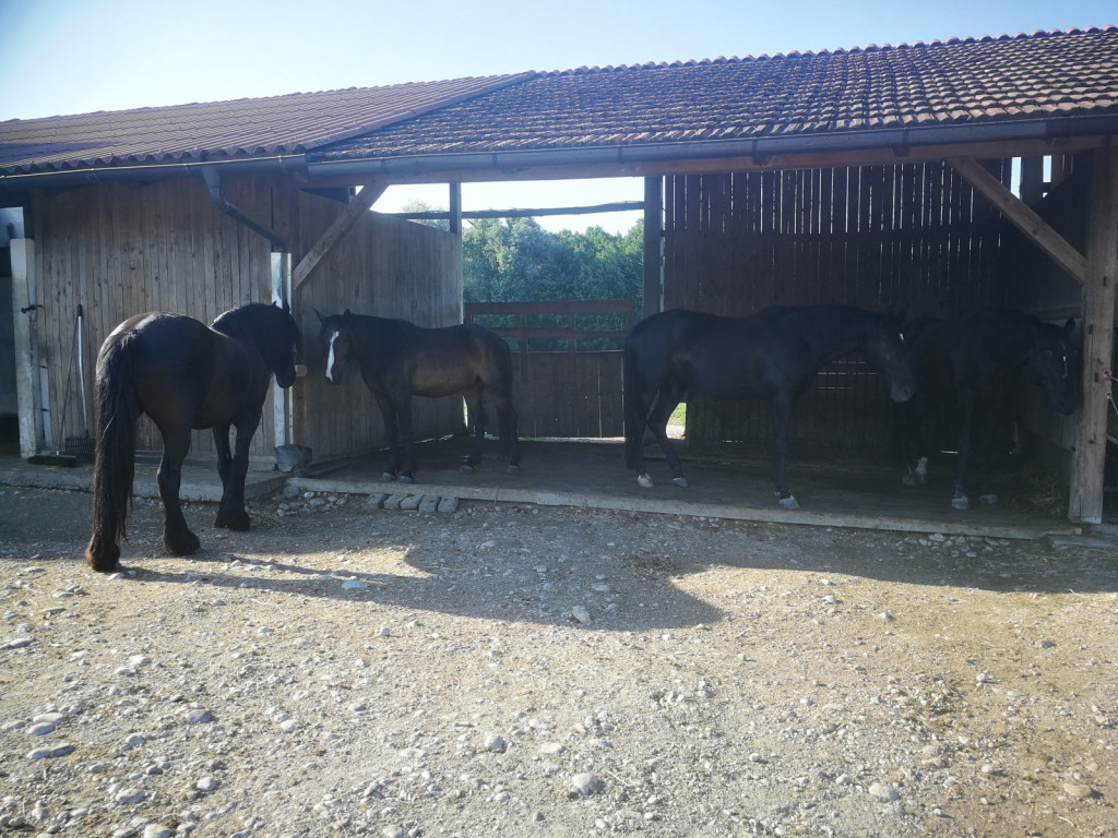 Prišlek je zaradi svoje dominantne narave uspel pridobiti vodilni položaj v čredi, zato je on pod streho, drugi konji pa so po vrsti postavljeni v hierarhičnem zaporedju pred zavetjem. Tovrstna postavitev se lahko pogosto kaže, ko konji čakajo na hranjenje.
