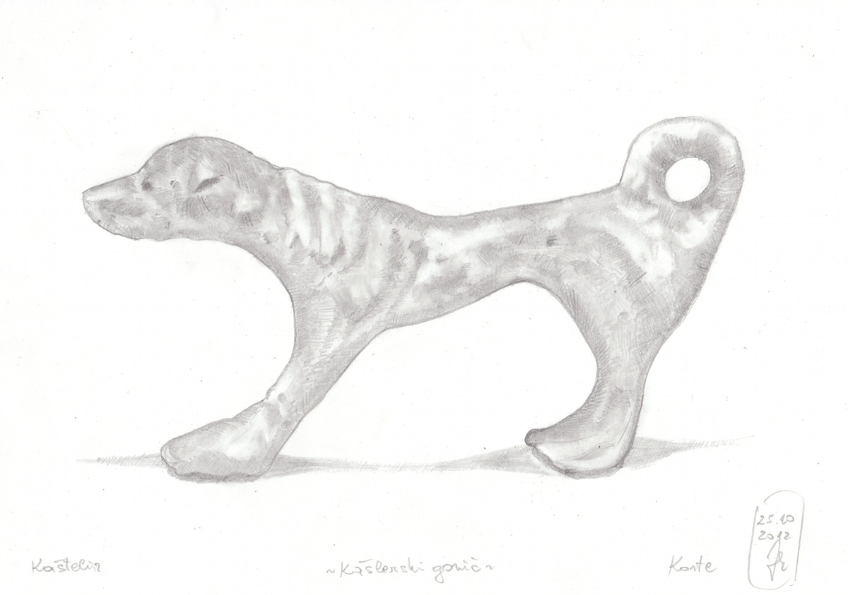 Kašlerski gonič- Izjemno arheološko odkritje »Kašlerski gonič«, je bil naslov prispevka o novi pridobitvi Pomorskega muzeja »Sergej Mašera« v Piranu. V tekstu najdemo naslednji opis: »Pod novodobno plastjo nasutih kamnov, ki so verjetno služili za utrditev in drenažo terase, je bila odkrita zaplata prsti z ogljem, v kateri je ležala dobro ohranjena bronasta figurica psa. Na značilnost figuralike mlajše železne dobe opozarjata spojeni prednji in zadnji nogi, zankasto zvit rep, dokaj realistično oblikovana glava in trup z nakazanimi mišicami ter v sklenjen krog oblikovan rep«. V nadaljevanju tudi izvemo, da je simbolika psa v številnih mitologijah sveta zapletena, povsod pa prevladuje njegov simbol kot poznavalca tuzemskega in onstranskega človeškega življenja. Figurico psa iz Kaštelirja so poimenovali »Kašlerski gonič«.