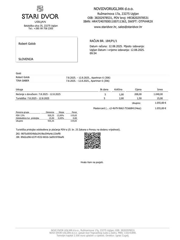 Pri skeniranju QR kode se sicer odpre povezava na porezna.gov.hr, torej je JIR števika računa videti pravilna, žal ni možno preveriti, če je račun pravi, ali ponaredek, ker se da na hitro preveriti samo račune, ki niso starejši od 30 dni. Kar me na računu bolj moti je, da v okvirčku pod prejemnik računa piše samo ROBERT GOLOB, Slovenija......to definitivno ne bo v redu, ker se morajo pri rezervacijah in plačilih računov hotelskih rezervacij navesti popoln naslov....saj ste že spali v hrvaških hotelih, pa veste, kako mora račun v celoti izgledati. Meni izgleda, kot da je račun pravilen, samo naslovnik je retuširan, dokazilo o plačilu pa lahko ponaredi vsak z osnovnim znanjem dela z računalnikom.