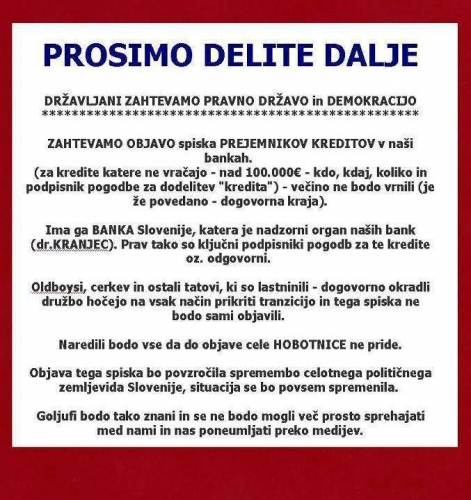 Se to sploh še kdo vpraša, je sploh še od vse te politične elite, komu mar za nas državljane ali bi nas resnično najrajši potopili v žlici zastrupljene vode brez kisika ali prodali za keš, še tega pa pospravili in prenesli v davčne oaze. Vemo kako delujejo, da nas želijo spraviti na beraške palice in kaj vse prikrivajo pred ljudmi, kakšni so njihovi cilji, vseh njih, kateri so sedaj in tudi tistih, ki so bili na funkcijah vsa ta leta…Ljudi spraviti ob vse, uničiti še tisto malo kar imamo, napraviti nas za tlačene, sami, z vso to kradljivo bando v državi, pa uspeti, se obogatiti in vladati nam siromakom!...« Ne!.., tega veselja pa vam žal ne bomo dali, izropali ste nas že vsega, pustošite še kar naprej, le nečega pa vam ne bo uspelo uničiti, našega dostojanstva in zavedanja, da smo suvereni državljani in te Slovenije vam ne bo uspelo uničiti v popolnosti, pozabite!... Borba je pred vrati in ne bo vam uspelo, nas pokončati NE!!!«