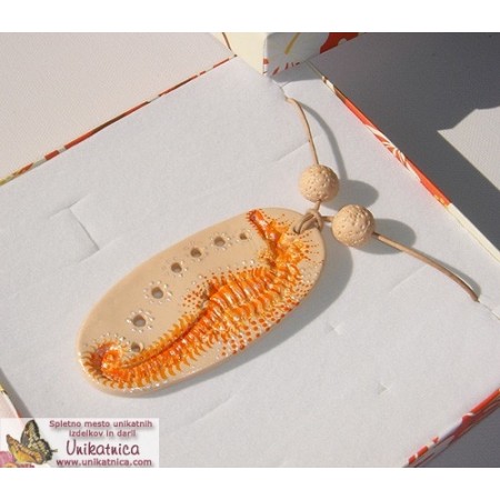 Eko nakit iz gline - ročno izdelana glinena ogrlica-obesek, z motivom reliefa morskega konjička, ročna poslikava http://www.unikatnica.com/eko-nakit-iz-gline/770-ogrlica-morski-konjicek-oranzna.html
