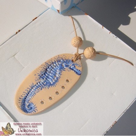Eko nakit iz gline - ročno izdelana glinena ogrlica-obesek, z motivom reliefa morskega konjička, ročna poslikava http://www.unikatnica.com/eko-nakit-iz-gline/772-ogrlica-morski-konjicek-modra.html