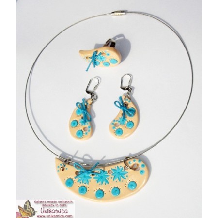 Eko nakit iz gline - ročno izdelana glinena ogrlica, prstan in uhani, z ročno poslikavo http://www.unikatnica.com/eko-nakit-iz-gline/730-ogrlica-prstan-uhani-svetlo-modra.html