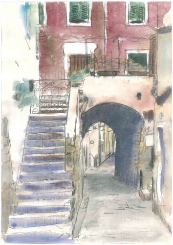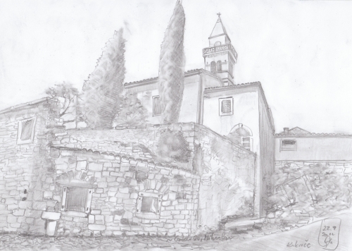 Piran - Pogled s Tartinijevega trga na zvonik cerkve Sv.Jurija Risba s svinčnikom / Akvarel Dimenzija: 29 x 40 cm