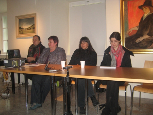 PODOBE ČIPKE, voditeljica - na levi- Afrodita Hebar Kljun, Udeleženci posveta: - MOJCA FERLE, kustodinja za urbano etnologijo, Mestni muzej Ljubljana - VIDA KEJŽAR, risarka vzorcev, Škofja Loka - TINA KODER GRAJZAR, oblikovalka sodobne avtorske idrijske čipke, Ljubljana - MANCA AHLIN, arhitektka in ustvarjalka na področju čipkarstva, New York (preko Skypa)