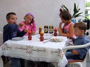 Domen, Zarja, Blažka in Urban pri jutranjem zajtrku