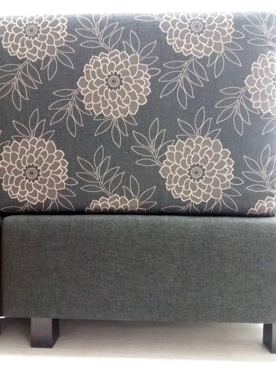 Barvna kombinacija 1 (kot na sliki) - antrazitna tkanina z nežno lila rožnatim vzorcem za POSTELJNO KONČNICO in TABURE. Postelja iste antrazit barve
