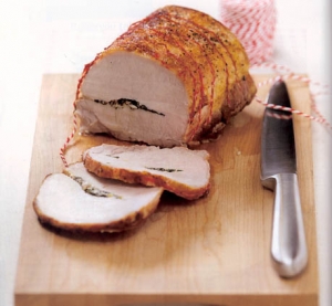 Po peki meso pokrijemo z aluminijasto folijo in ga pustimo počivati 10 do 15 minut. Nato odstranimo sukanec in zvitek narežemo na 8 do 12 rezin.