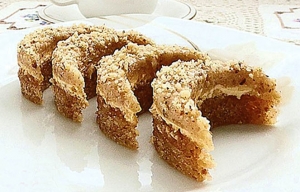 Sladkor z jajci in malo limonine lupinice stepamo, da se dobro speni, dodamo žlico vode in stepamo najprej v vroči vodi, da se segreje, nato pa v mrzli, da se popolnoma ohladi. Hladni zmesi primešamo moko in raztopljeno maslo. Zmes namažemo na papir, položen na pekač, in pečemo na srednji vročini. Pečeno testo poveznemo s papirjem vred na desko, odstranimo papir in testo prerežemo. Eno polovico namažemo z masleno orehovo kremo, jo pokrijemo z drugo, prelijemo z ledom ali potresemo z mletimi orehi in razrežemo na polmesece.