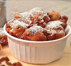 Sestavine: 150 g moke, 1 kavna žlička pecilnega praška, 20 g sladkorja, 2 jajci, 150 g skute, 2 žlici kisle smetane, 1 zavitek vaniljevega sladkorja, malo nastrgane limonine lupinice, 50 g mešanega kandiranega sadja, malo ruma; in še: olje za cvrenje, sladkor v prahu za posip.