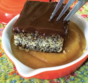 Sestavine (za 15 koščkov): 3 jogurtove lončke moke, 2 lončka drobno mletega maka, 1 in pol lončka rjavega sladkorja, pol žličke pecilnega praška, lonček mleka, pol lončka olja, 4 jajca, 2 žlici ruma, žlička vaniljeve arome ali 1 strok vanilje; sirup: 400 ml vode, 40 g sladkorja; preliv: 250 g jedilne čokolade, 1 žlička masla; dušena jabolka: 4 jabolka, cimet, limonina lupinica, sladkor po okusu, maslo.