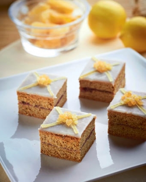 Dve tretjini testa razvaljamo po pomaščenem pekaču vewlikosti 30 x 20 x 5 cm. Iz preostalega testa razvaljamo neak pravokotnik. Testo na pekaču namažemo z marmelado, nanj položimo drug pravokotnik in vse skupaj pečemo približno 20 minut. Pečico segrejemo na 200 stopinj. Sladkor v prahu zmešamo z limoninim sokom v gosto tekoč obliv, ga prelijemo po toplem pecivu, razrežžemo v pravokotnike in poptresemo s koščki kandiranega ingverja.