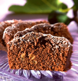 Sestavine: 125 g masla, 230 g sladkorja, 2 jajci, 180 g moke, pol zavitka pecilnega praška, 40 kakava v prahu, 180 ml mleka, 125 g suhih fig, 75 g kandirane pomarančne lupine, 60 g naribane čokolade.
