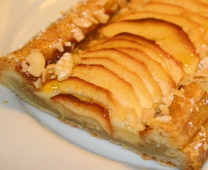 Jabolka olupimo in narežemo na tanke krhlje. Listnato testo na tanko razvaljamo ter ga razrežemo na tri daljše pravokotnike. Vsak pravokotnik nekajkrat prebodemo z zobotrebcem, na vsaki strani pa pustimo centimeter za rob peciva. Na vsak kos listnatega testa damo tudi malo masla in po njem razvrstimo jabolčne krhlje. Vsak kos testa s krhlji osladkamo z dvema žlicama sladkorja in potresemo z malo cimeta. Pečemo v prej ogreti pečici pri 200 stopnjah 30 minut. Kolač lahko jemo topel ali hladen.