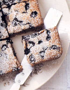 Pečico segrejemo na 150 stopinj Celzija. Pravokoten model velikosti 15 × 30 cm namažemo z maslom in obložimo s papirjem za peko. Orehe damo v multipraktik in jih v več krajših intervalih zmeljemo v manjše koščke. Dodamo sladkor, moko in limonino lupinico ter kakšno minuto meljemo. Suhe sestavine stresemo v skledo in vmešamo stopljeno maslo. Beljake stepemo v mehak sneg, ki ga nato pazljivo vmešamo v oreškasto zmes. Maso vlijemo v pripravljeni model in po vrhu posujemo z borovnicami. Pečemo 25 do 30 minut, potem pustimo pecivo, da se ohladi v modelu. Crema fraiche (ali kislo smetano) damo v skledico in vanjo zelo počasi vmešamo vaniljevo esenco. Pecivo narežemo na rezine ali kvadrate in jih ponudimo z žlico vaniljeve smetane.