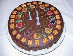 Testo: 250 g polnovredne (pirine) moke, 120 g masla, 100 g sladkorja, 2 jajci, 1/2 zavitka praška vinskega kamna, 100 g mletih orehov (ali lešnikov, mandljev), orehi za krašenja, 100 g zmehčane temne čokolade, mleko po potrebi; nadev: 7 dl sladke smetane, 1 do 2 zavitka biosredstva za utrjevanje smetane, izkoščičene višnje iz enega kozarca; obloga in preliv: za oblogo: razno sadje, vloženo ali sveže, mehkejše; za preliv: 1/2 l jabolčnega soka, 2 žlici agar-agarja v prahu.