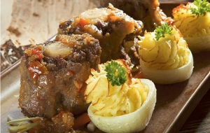 Za 4 osebe potrebujemo: 1,6 kg mladega govejega repa, narezanega na zglobe, 2 večji čebuli, 2 korenčka, 1/4 manjše zelene, 3 stroki česna, ščepec mlete kumine, sol, poper, oljčno olje, sesekljan peteršilj.