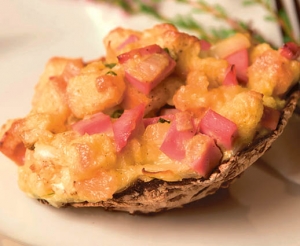 Sestavine: 6 dežnikaric (»marel«), 2 rezini opečenca, 2 šalotki, 1 šopek peteršilja, 150 g kuhane šunke, 60 g sira, 2 žlici masla, 1 jajce, 3 žlice kisle smetane, sol, poper, muškatni orešek.