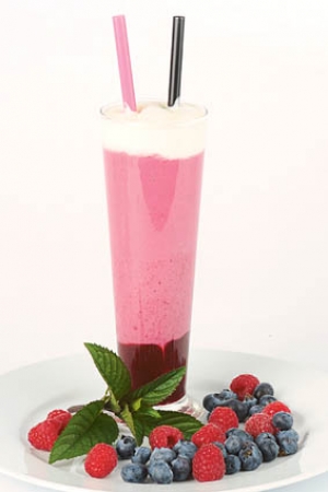 Gozdne sadeže damo v mešalnik in zmešamo v kašo. Če nas motijo koščice, lahko precedimo. Polovico nalijemo v izbrane kozarce, preostali masi pa dodamo sladkor, vanilijev sladkor, pinjenec in polovico sladke smetane ter dobro zmešamo. Zmes nalijemo v kozarce. Preostalo sladko smetano napol stepemo in jo nadevamo v čaše z napitkom. Poljubno okrasimo in postrežemo.