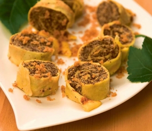 Testo: žvrkljano testo za sladke palačinke; nadev: 3 dl mleka, 100 g mletega maka, 2 jajci, 6 žlic kisle smetane, 2 vaniljeva sladkorja, 4 žlice drobtin; zabela: 40 g masla, 50 g drobtin.