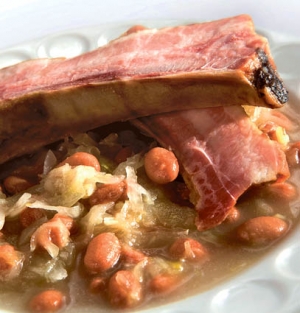 Potrebujemo: 500 g fižola, 500 g prekajenih svinjskih rebrc, 1 kg kislega zelja, sol, mleti poper, 3 stroki česna, pol čebule, 3 žlice olja, 1 žlica moke