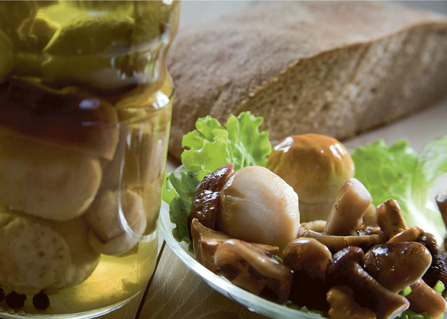 Potrebujemo: 1 kg jurčkov, 400 ml vode, 4 stroke česna, 4 lovorove liste, 10 poprovih zrn, 3 vejice bazilike, 100 ml belega kisa, 15 g soli, 4 žlice oljčnega olja