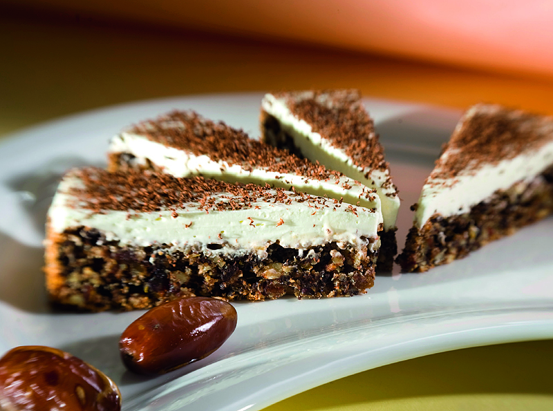Sestavine: za testo: 100 g mandljev, 120 g temne čokolade, 120 g suhih datljev brez koščic, 3 beljaki, 125 g sladkorja, 1 limona; za kremo: 150 g sladke smetane, 20 g sladkorja, 1 zavitek vaniljevega sladkorja, 30 g temne čokolade
