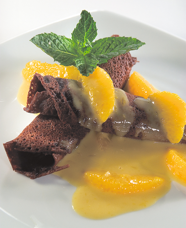 Polovico mleka segrejemo le toliko, da v njem raztopimo čokolado. Nekoliko ga ohladimo, dodamo drugo polovico mleka, moko, kakavov prah, jajci, 2 žlici pomarančnega soka in razžvrkljano testo za palačinke. Palačinke spečemo na maslu na blagem ognju.