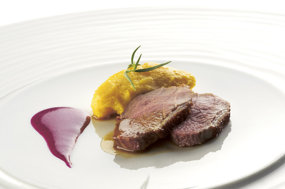 Sestavine: 4 kosi račjih prsi, 1 žlica olja, 3 dl račje osnove, 50 g masla, 1 žlička marelične marmelade, 1 vejica pehtrana; za pire: 200 g rumene buče, 200 g kolerabe, 80 g masla, sol; za sok rdeče pese: 120 g sveže rdeče pese, 1 jajce, 1,5 dl olja, sol