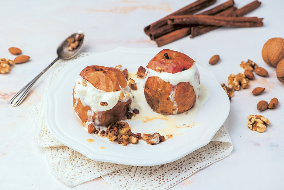 Jabolka prerežemo tako, da jim odrežemo zgornji del, pokrovčke. Vsakemu jabolku izdolbemo sredico in pri tem pazimo, da ne preluknjamo dna. Mandlje in orehe grobo sesekljamo ter jih zmešamo z medom, limonovim sokom in cimetom. Z mešanico napolnimo izdolbena jabolka, jih pokrijemo s pokrovčki in jim z vilicami nekajkrat prebodemo lupino. Položimo jih na pekač, prekrit s papirjem za peko. Pečemo jih pri 180 stopinjah približno 20 minut. Stepemo sladko smetano, ji dodamo malo vaniljeve arome. Z njo nadevamo ohlajena, še mlačna jabolka in jih ponudimo.