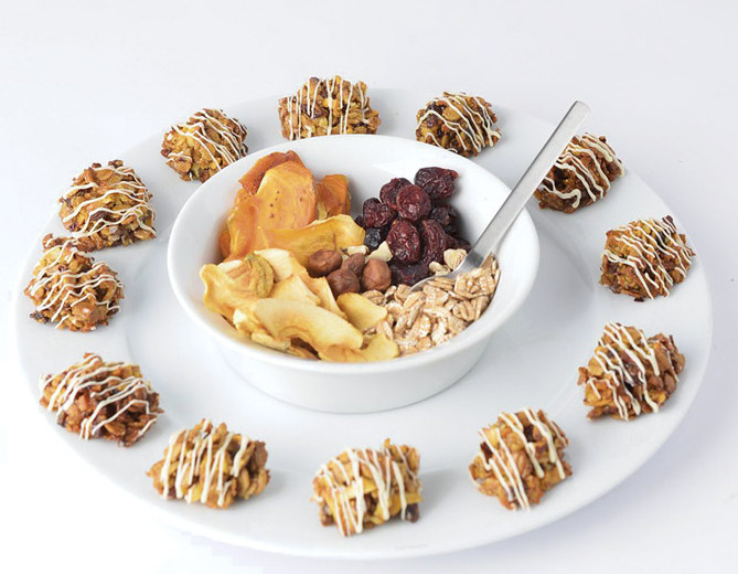 Sestavine: (za približno 700 g piškotov) za testo: 250 g pirinih kosmičev, 100 g nasekljanih lešnikov, 120 g masla, 200 g suhega sadja (hruške, fige, jabolka, kakiji, brusnice), 2 jajci, 100 g cvetličnega medu, nastrgana pomarančna lupinica, vaniljeva aroma, temna čokolada za okrasitev piškotov