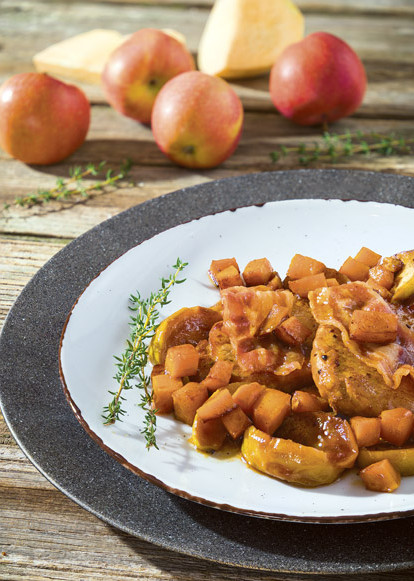 Sestavine (za 2 osebi): 2 svinjska kotleta brez kosti (vsak po 200 g), 100 g dimljene slanine, 300 g kolerabe, 2 manjši jabolki, 5 g masla, 1 žlica olja, 330 ml jabolčnega vina (cidre), sol, sveže mleti beli poper, ¼ žličke mlete kumine, ½ žličke suhega timijana