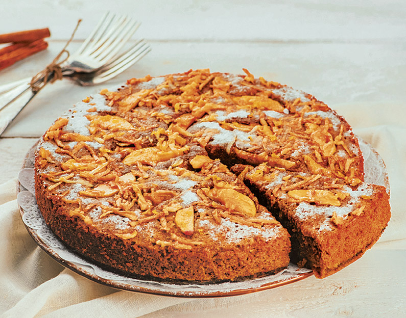 Sestavine (za tortni model premera 26 cm): za biskvit: 6 jajc, 150 g mletega sladkorja, 1 vrečka vaniljevega sladkorja, 4 dl polnomastnega mleka, 350 g moke, 1 vrečka pecilnega praška, 3 zvrhane žličke mletega cimeta, 5 zdrobljenih klinčkov, ščepec mletega muškatnega oreščka, naribana lupinica 1 biolimone; za nadev: 450–500 g jabolk; za posip: mleti sladkor