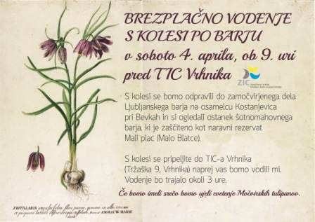 Aprila zopet začenjamo z brezplačnimi vodenji vsako prvo soboto v mesecu. Tako se bomo 4. aprila s kolesi podali na Ljubljansko barje. Prikolesarite pred TIC Vrhnika (Tržaška 9) ob 9. uri, nato pa bomo skupaj nadaljevali pot proti zamočvirjenem predelu Ljubljanskega barja in si ogledali ostanek šotnomahovnega barja, ki je zaščiteno kot naravni rezervat - Mali plac (Malo Blatce). Na tokratnem vodenju se bomo družili okoli 3 ure.