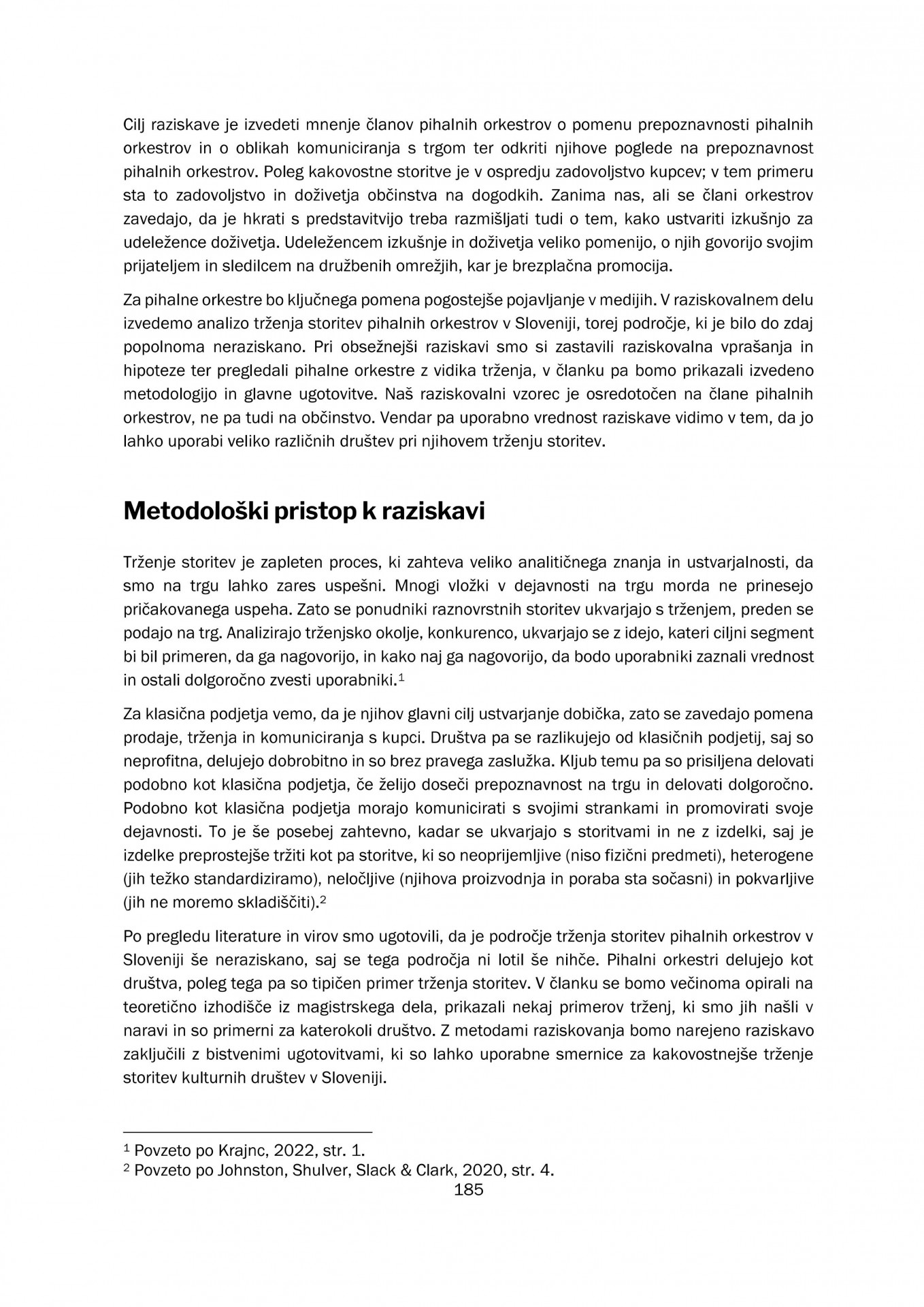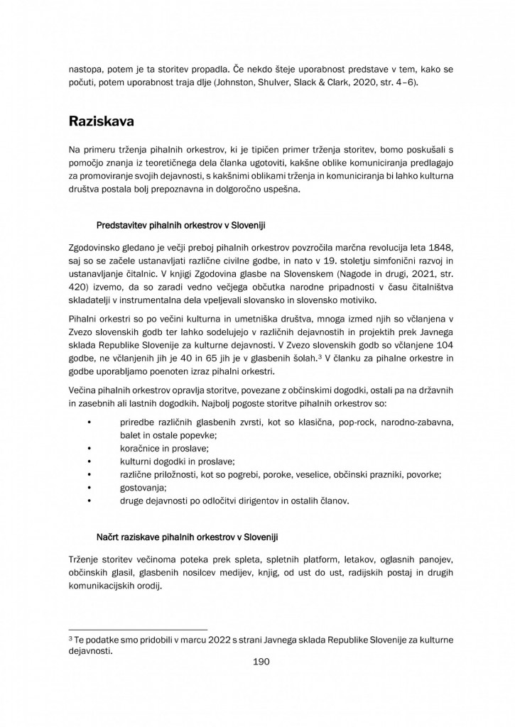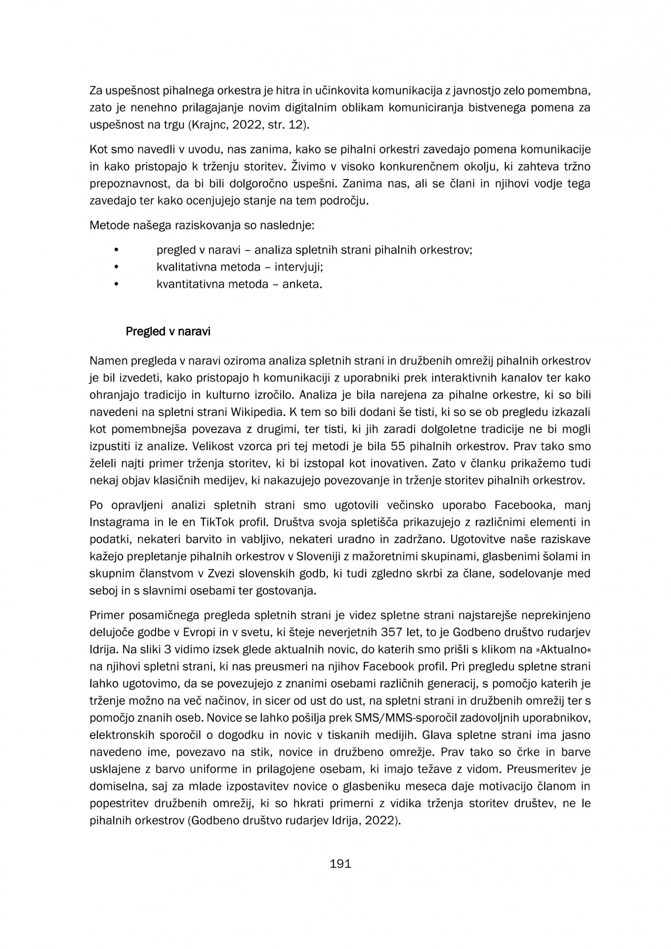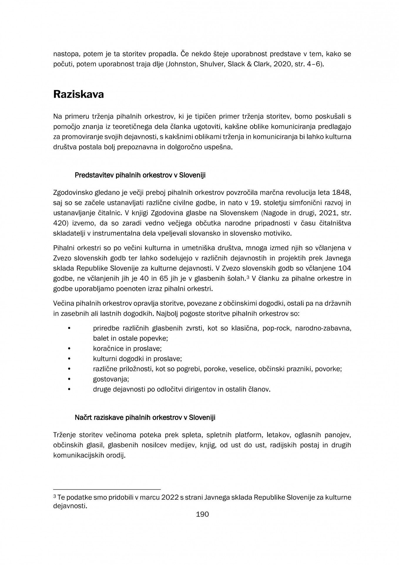 V članku bomo strnili prikaz trženja storitev pihalnih orkestrov, ki smo ga proučili teoretično in praktično z različnimi metodami raziskovanja v obširneje opravljeni analizi magistrskega dela Trženje storitev pihalnih orkestrov v Sloveniji spomladi 2022 in nato preverili za namen tega članka. Naš namen je ugotoviti, s kakšnimi oblikami trženja in komuniciranja bi pihalni orkestri postali bolj prepoznavni. S to raziskavo bomo med drugim skušali okrepiti zavedanje o trženju storitev pihalnih orkestrov v Sloveniji, ki so večinoma kulturno-umetniška društva. S pomočjo izvedene ankete bomo ugotovili, kje sami člani puščajo digitalne odtise – kar bi bilo pri nadaljnjih raziskavah priporočljivo ugotoviti, kje jih njihovo občinstvo pušča za seboj. Zato bomo pri raziskavi osredotočeni predvsem na temeljno raziskovalno vprašanje: kako strokovno je treba pristopiti k trženju storitev danes, v tem visoko konkurenčnem okolju, da bi lahko bili dolgoročno uspešni. 185 Cilj raziskave je izvedeti mnenje članov pihalnih orkestrov o pomenu prepoznavnosti pihalnih orkestrov in o oblikah komuniciranja s trgom ter odkriti njihove poglede na prepoznavnost pihalnih orkestrov. Poleg kakovostne storitve je v ospredju zadovoljstvo kupcev; v tem primeru sta to zadovoljstvo in doživetja občinstva na dogodkih. Zanima nas, ali se člani orkestrov zavedajo, da je hkrati s predstavitvijo treba razmišljati tudi o tem, kako ustvariti izkušnjo za udeležence doživetja. Udeležencem izkušnje in doživetja veliko pomenijo, o njih govorijo svojim prijateljem in sledilcem na družbenih omrežjih, kar je brezplačna promocija. Za pihalne orkestre bo ključnega pomena pogostejše pojavljanje v medijih. V raziskovalnem delu izvedemo analizo trženja storitev pihalnih orkestrov v Sloveniji, torej področje, ki je bilo do zdaj popolnoma neraziskano. Pri obsežnejši raziskavi smo si zastavili raziskovalna vprašanja in hipoteze ter pregledali pihalne orkestre z vidika trženja, v članku pa bomo prikazali izvedeno metodologijo in glavne ugotovitve. Naš raziskovalni vzorec je osredotočen na člane pihalnih orkestrov, ne pa tudi na občinstvo. Vendar pa uporabno vrednost raziskave vidimo v tem, da jo lahko uporabi veliko različnih društev pri njihovem trženju storitev.