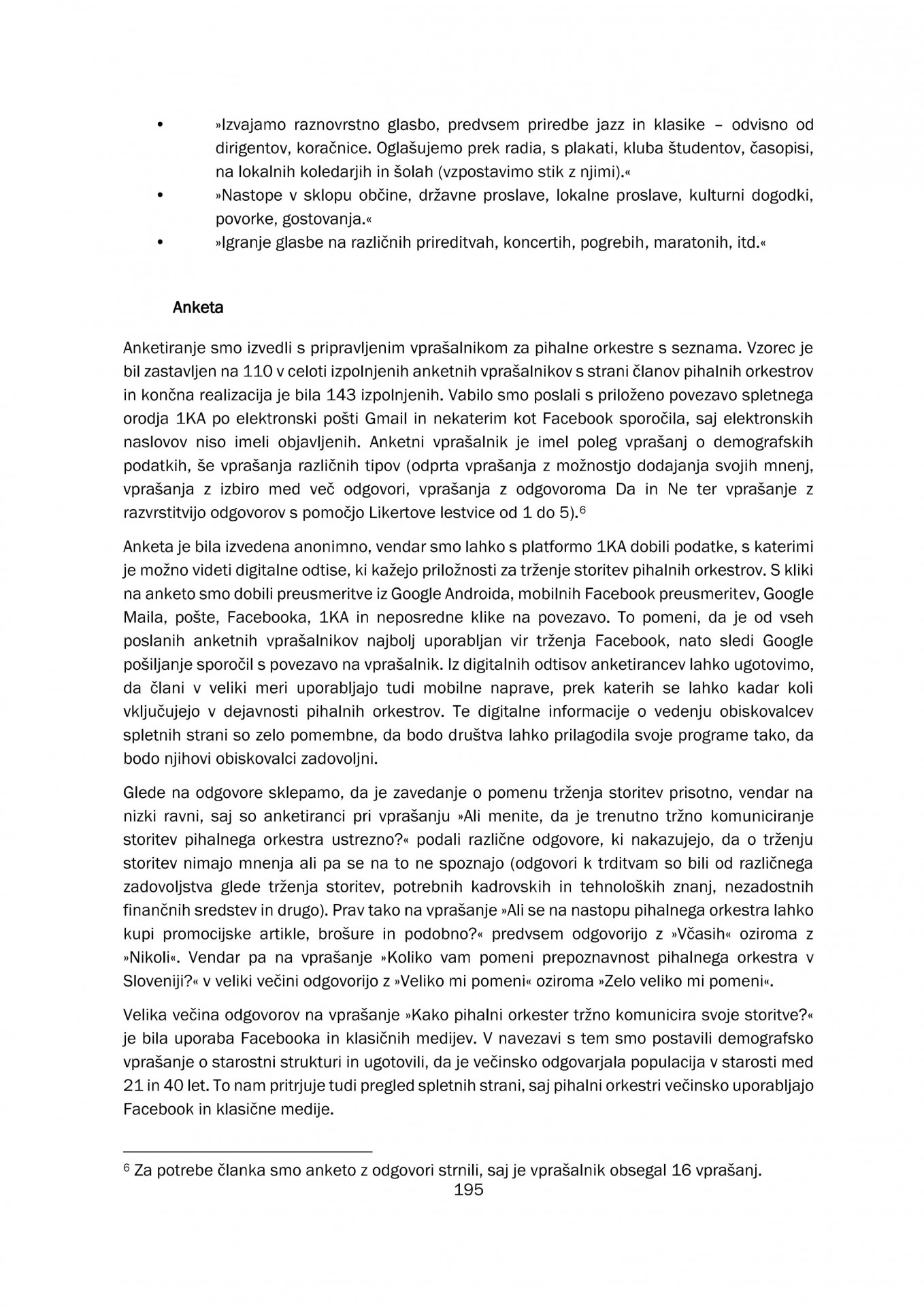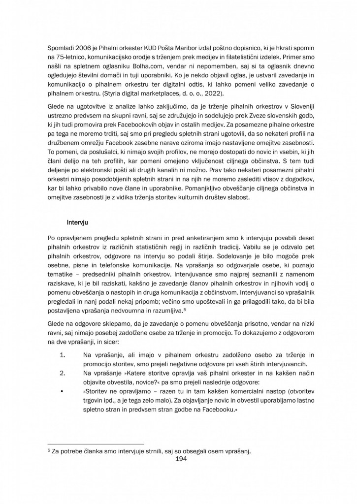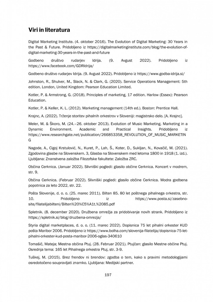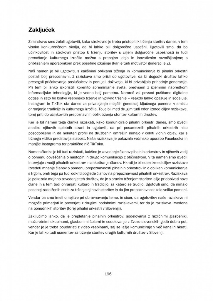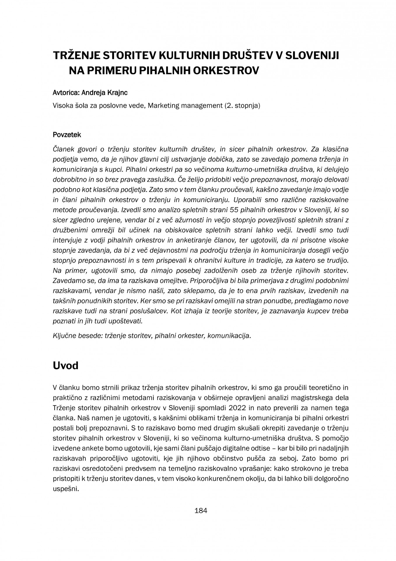 V članku bomo strnili prikaz trženja storitev pihalnih orkestrov, ki smo ga proučili teoretično in praktično z različnimi metodami raziskovanja v obširneje opravljeni analizi magistrskega dela Trženje storitev pihalnih orkestrov v Sloveniji spomladi 2022 in nato preverili za namen tega članka. Naš namen je ugotoviti, s kakšnimi oblikami trženja in komuniciranja bi pihalni orkestri postali bolj prepoznavni. S to raziskavo bomo med drugim skušali okrepiti zavedanje o trženju storitev pihalnih orkestrov v Sloveniji, ki so večinoma kulturno-umetniška društva. S pomočjo izvedene ankete bomo ugotovili, kje sami člani puščajo digitalne odtise – kar bi bilo pri nadaljnjih raziskavah priporočljivo ugotoviti, kje jih njihovo občinstvo pušča za seboj. Zato bomo pri raziskavi osredotočeni predvsem na temeljno raziskovalno vprašanje: kako strokovno je treba pristopiti k trženju storitev danes, v tem visoko konkurenčnem okolju, da bi lahko bili dolgoročno uspešni. 185 Cilj raziskave je izvedeti mnenje članov pihalnih orkestrov o pomenu prepoznavnosti pihalnih orkestrov in o oblikah komuniciranja s trgom ter odkriti njihove poglede na prepoznavnost pihalnih orkestrov. Poleg kakovostne storitve je v ospredju zadovoljstvo kupcev; v tem primeru sta to zadovoljstvo in doživetja občinstva na dogodkih. Zanima nas, ali se člani orkestrov zavedajo, da je hkrati s predstavitvijo treba razmišljati tudi o tem, kako ustvariti izkušnjo za udeležence doživetja. Udeležencem izkušnje in doživetja veliko pomenijo, o njih govorijo svojim prijateljem in sledilcem na družbenih omrežjih, kar je brezplačna promocija. Za pihalne orkestre bo ključnega pomena pogostejše pojavljanje v medijih. V raziskovalnem delu izvedemo analizo trženja storitev pihalnih orkestrov v Sloveniji, torej področje, ki je bilo do zdaj popolnoma neraziskano. Pri obsežnejši raziskavi smo si zastavili raziskovalna vprašanja in hipoteze ter pregledali pihalne orkestre z vidika trženja, v članku pa bomo prikazali izvedeno metodologijo in glavne ugotovitve. Naš raziskovalni vzorec je osredotočen na člane pihalnih orkestrov, ne pa tudi na občinstvo. Vendar pa uporabno vrednost raziskave vidimo v tem, da jo lahko uporabi veliko različnih društev pri njihovem trženju storitev.