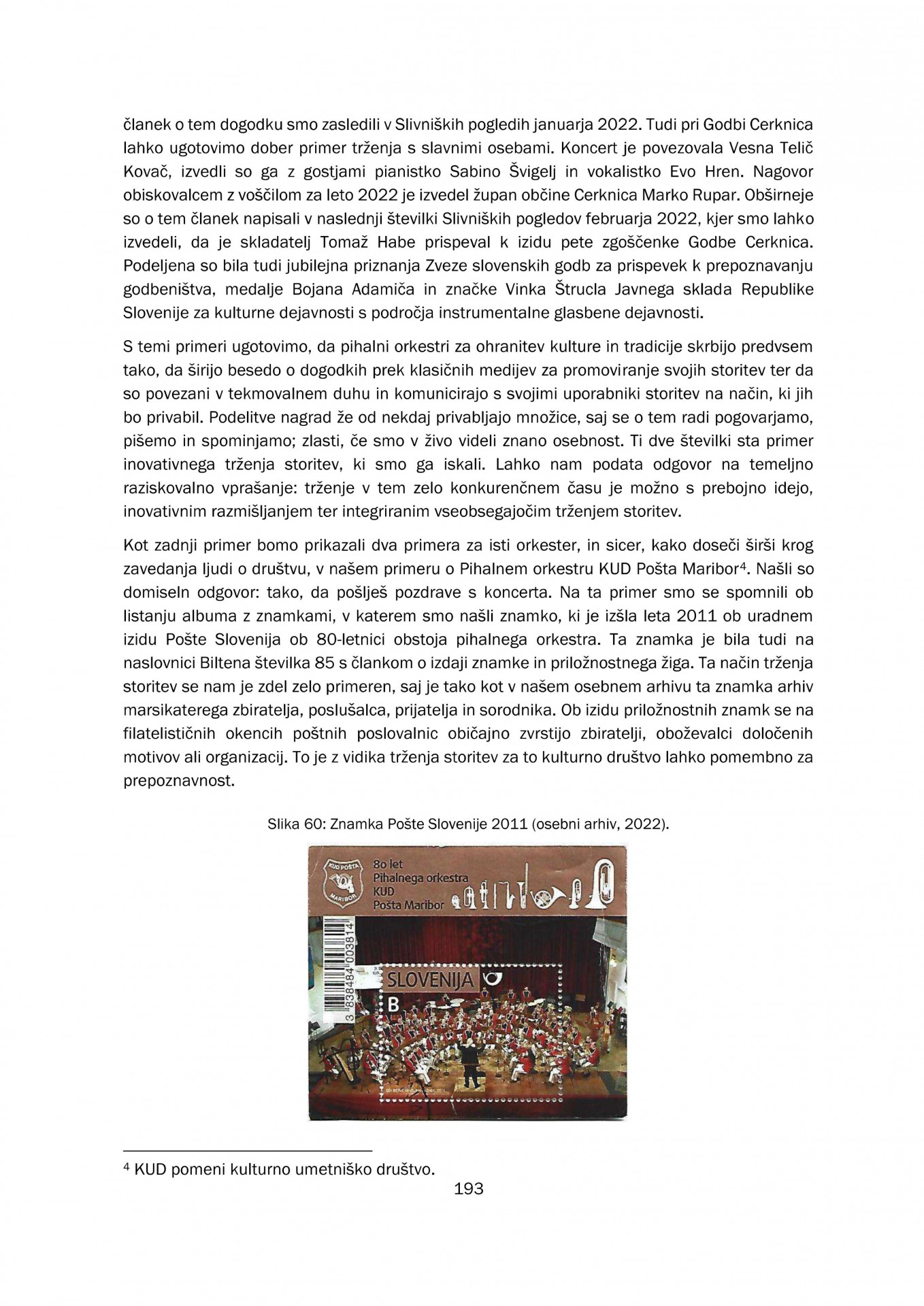 Članek govori o trženju storitev kulturnih društev, in sicer pihalnih orkestrov. Za klasična podjetja vemo, da je njihov glavni cilj ustvarjanje dobička, zato se zavedajo pomena trženja in komuniciranja s kupci. Pihalni orkestri pa so večinoma kulturno-umetniška društva, ki delujejo dobrobitno in so brez pravega zaslužka. Če želijo pridobiti večjo prepoznavnost, morajo delovati podobno kot klasična podjetja. Zato smo v tem članku proučevali, kakšno zavedanje imajo vodje in člani pihalnih orkestrov o trženju in komuniciranju. Uporabili smo različne raziskovalne metode proučevanja. Izvedli smo analizo spletnih strani 55 pihalnih orkestrov v Sloveniji, ki so sicer zgledno urejene, vendar bi z več ažurnosti in večjo stopnjo povezljivosti spletnih strani z družbenimi omrežji bil učinek na obiskovalce spletnih strani lahko večji. Izvedli smo tudi intervjuje z vodji pihalnih orkestrov in anketiranje članov, ter ugotovili, da ni prisotne visoke stopnje zavedanja, da bi z več dejavnostmi na področju trženja in komuniciranja dosegli večjo stopnjo prepoznavnosti in s tem prispevali k ohranitvi kulture in tradicije, za katero se trudijo. Na primer, ugotovili smo, da nimajo posebej zadolženih oseb za trženje njihovih storitev. Zavedamo se, da ima ta raziskava omejitve. Priporočljiva bi bila primerjava z drugimi podobnimi raziskavami, vendar je nismo našli, zato sklepamo, da je to ena prvih raziskav, izvedenih na takšnih ponudnikih storitev. Ker smo se pri raziskavi omejili na stran ponudbe, predlagamo nove raziskave tudi na strani poslušalcev. Kot izhaja iz teorije storitev, je zaznavanja kupcev treba poznati in jih tudi upoštevati.