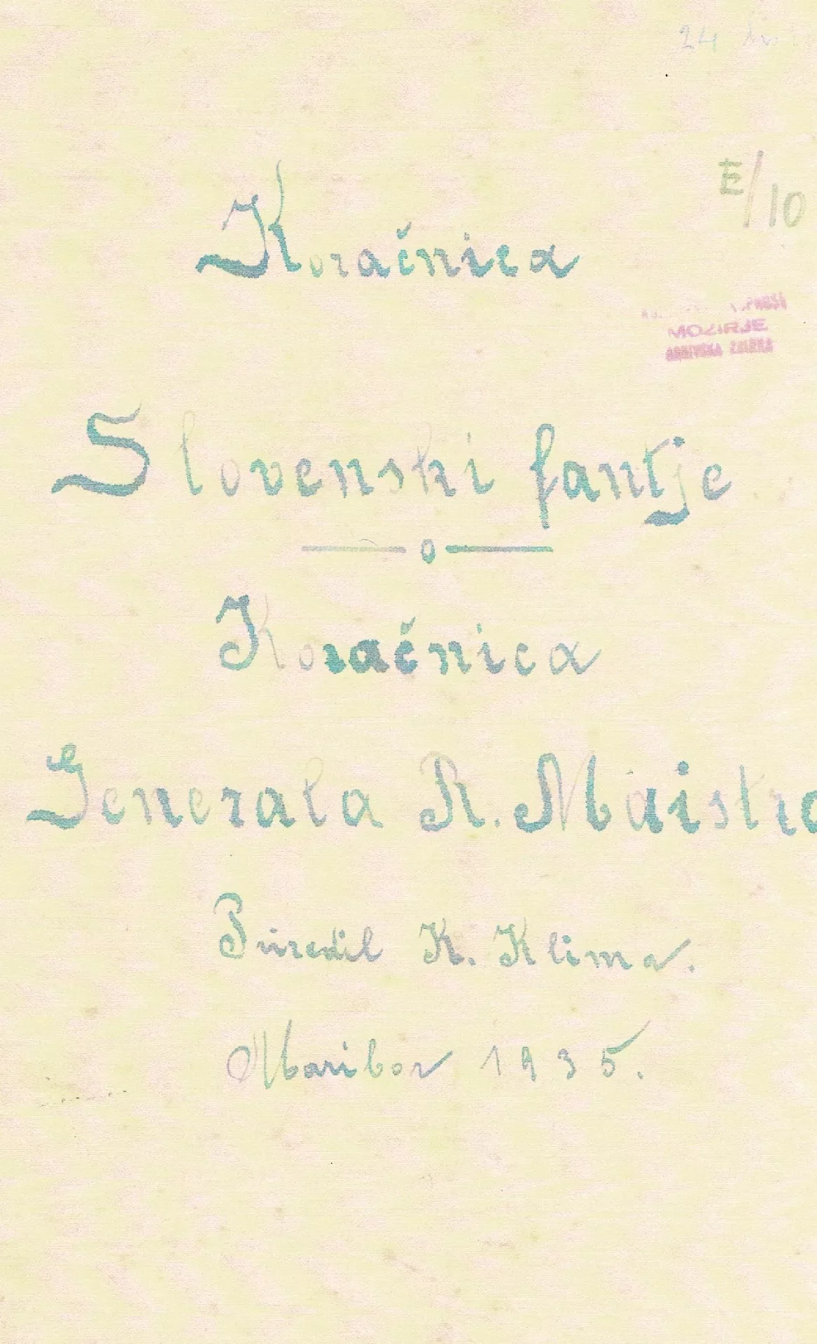 naslovnica Koračnice generala Maistra (glasba K. Klima; prir. F. Es, transkripcija J. Šalamon; Arhiv OSV