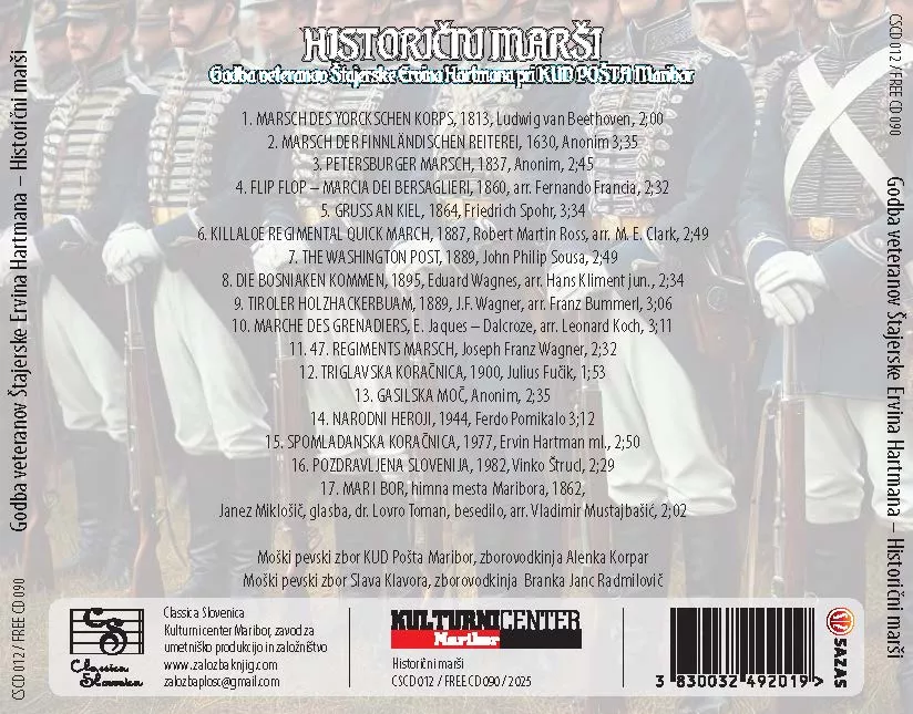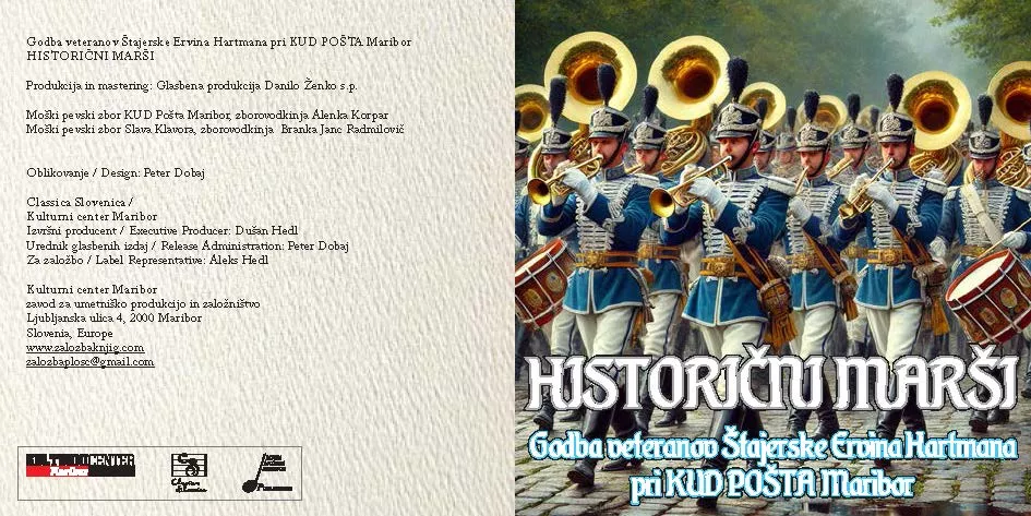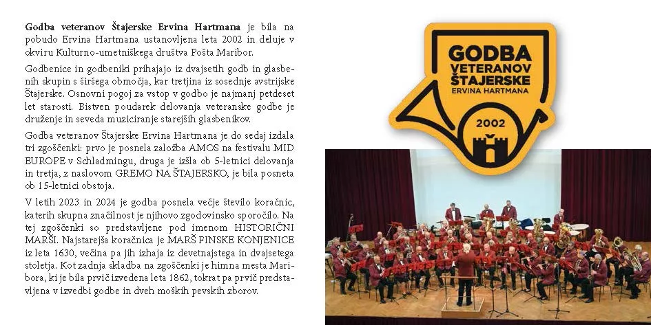 Ni dolgo tega, kar smo bili priča zelo lepo obiskanemu koncertu Godbe veteranov Štajerske Ervina Hartmana, kjer je občinstvo v mariborski dvorani Union nagradilo nastopajoče s stoječimi ovacijami, sedaj pa je na voljo njihov novi, že četrti CD pod nazivom »Historični marši«, v založbi Kulturnega centra Maribor.