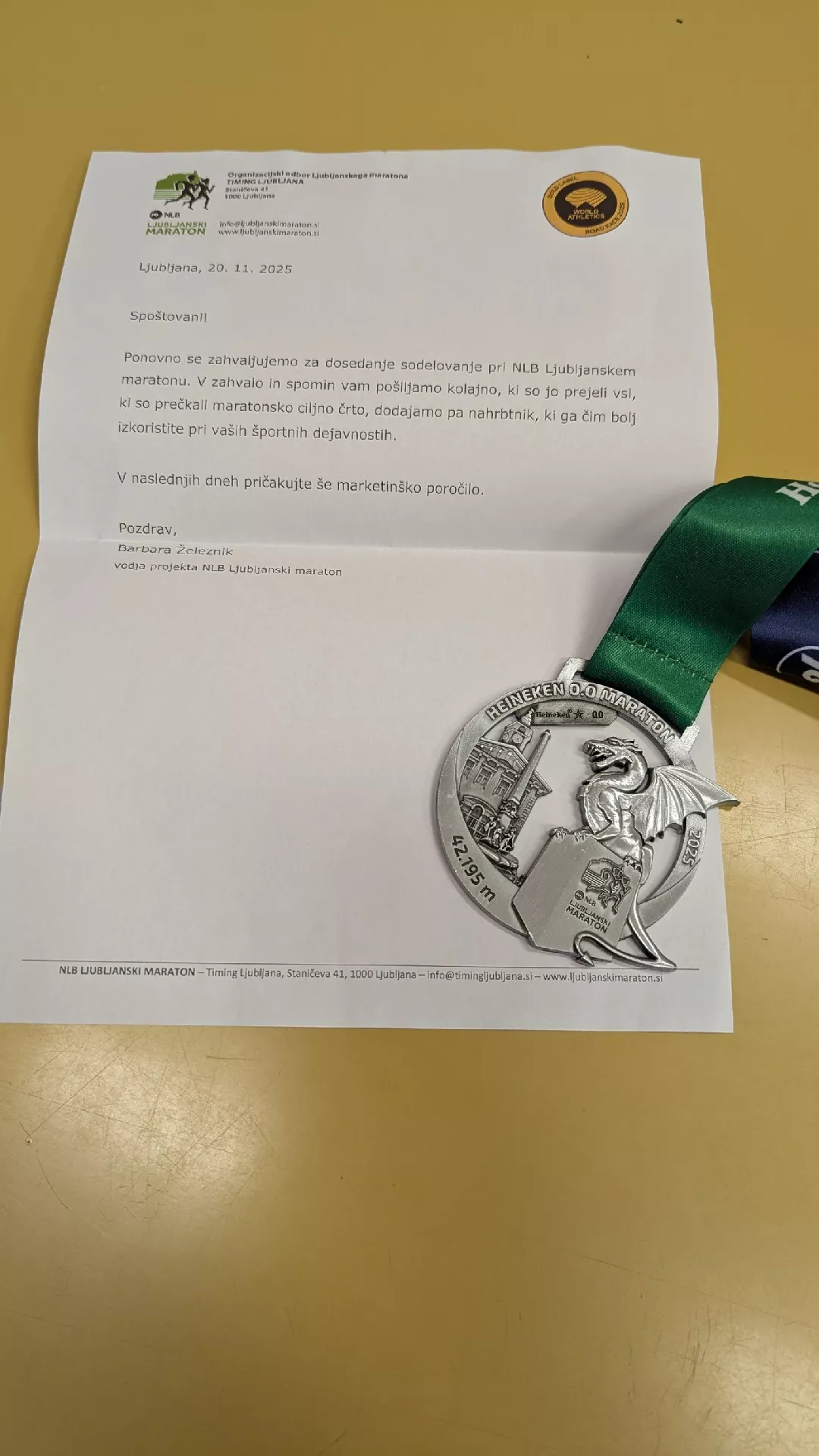 medalja in zahvala za sodelovanje na Ljubljanskem maratonu