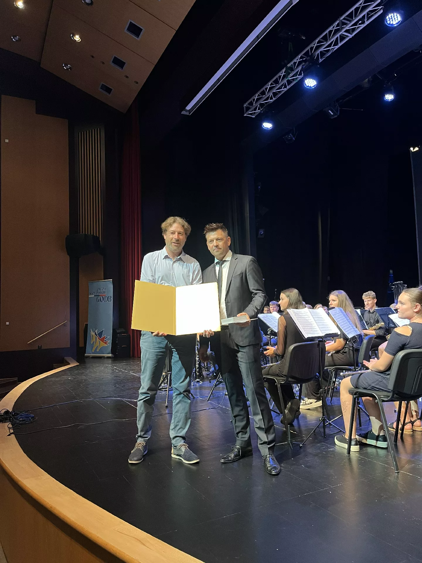 Pred začetkom zaključnega koncerta Musice creative, ki je potekal 23. avgusta v sežanskem Kosovelovem domu, je Daniel Leskovic, svetovalec za instrumentalno glasbo na JSKD in tudi dolgoletni član organizacijskega odbora Musice Creative, našemu dirigentu Mitji Tavčarju podelil listino Vinka Štrucla. Gre za priznanje, ki ga Javni sklad Republike Slovenije za kulturne dejavnosti podeljuje za pomemben doprinos k ljubiteljski instrumentalni glasbi. Mitji ob prejemu pomembnega priznanja iskreno čestitamo!