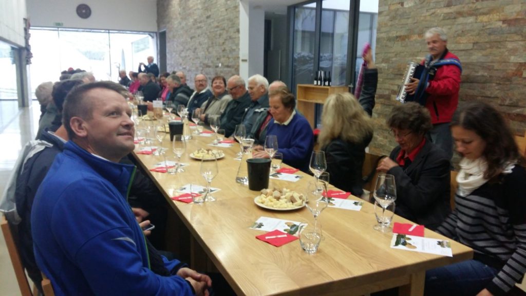 Ob 12. uri nas je avtobus odpeljal v klet Zlati grič. Zaradi močnega dežja smo si ogledali le notranjost kleti, ogled vinogradov, ki se razprostirajo v neposredni bližini, pa smo prihranili za kdaj v prihodnje, ko bo sijalo sonce. Vodička nas je popeljala skozi mogočne prostore kleti in nam razložila celoten postopek pridelave vina, od stiskanja grozdja do polnjenja v steklenice. Zatem je sledila degustacija vin znamke Zlati Grič. Med pokušanjem vin smo ob zvokih harmonike tudi zapeli. Ob vinu in harmoniki je čas kar prehitro minil in že nas je čakalo kosilo na bližnji izletniški kmetiji Polegek, Spodnje Gruškovje pri Slovenskih Konjicah, kjer so nam postregli z njihovo znano jedjo »meso izpod peke«.