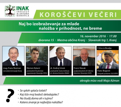 V sredo, 16. novembra 2016, ob 17. uri vas vabimo na OKROGLO MIZO o spremembah izobraževalnega sistema in njegovi vlogi pri stanju v slovenskem gospodarstvu z naslovom »Naj bo izobraževanje za mlade naložba v prihodnost, ne breme«, ki jo pripravlja Inštitut dr. Antona Korošca (INAK).