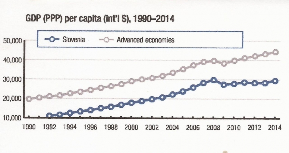 Vsakdo, ki resnično želi popeljati Slovenijo iz sedanje krize in ji zagotoviti nemoten razvoj in evropsko primerljiv življenjski standard, bi moral svoje ukrepe graditi na objektivni analizi sedanjega stanja. Sedanja slovenska vlada v svojem delovanju izhaja iz predpostavke, da smo krizo premagali, da nam gre bolje in že deli rezultate, ki naj bi jih fiktivno uspešno slovensko gospodarstvo prineslo. Dokaz za to so njeni dogovori s sindikati javnega sektorja itd. Objektivna analiza gospodarskega stanja teh trditev vlade seveda ne potrjuje, zato njene aktivnosti gospodarsko krizo prej ohranjajo in poglabljalo, kot pa rešujejo. V Strokovnem svetu pri predsedniku SLS v nasprotju z vlado pripravljamo gospodarski program na osnovi zanesljivih strokovnih analiz priznanih mednarodnih inštitucij, konkretno World Economic Forum (WEF). Primerjava bruto domačega proizvoda (BDP) med Slovenijo in povprečkom razvitih držav je prikazan na Sliki 1.