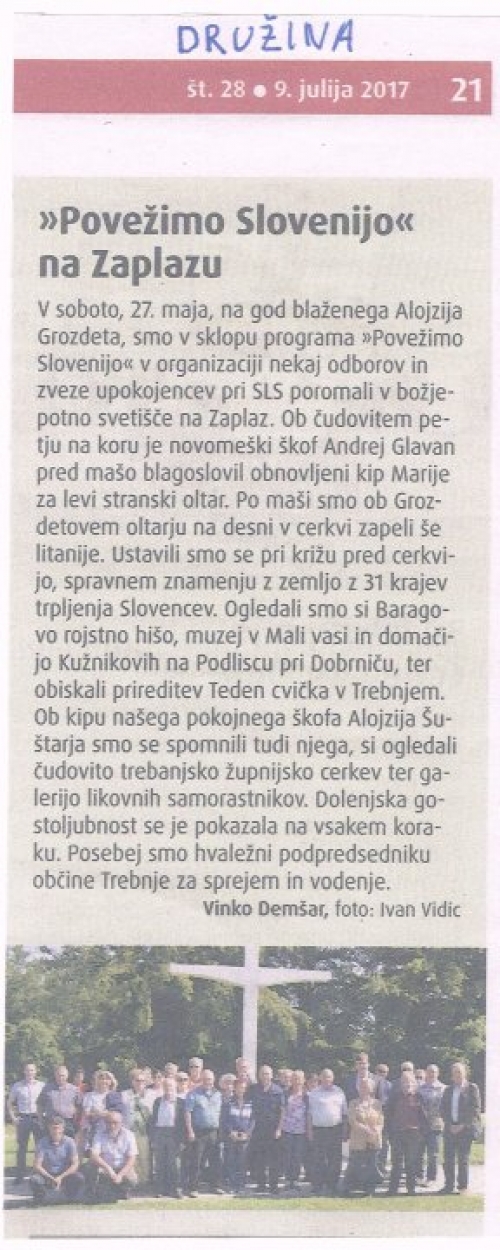 Ljubljana, 10. julij 2017 – V aktualni številki revije Družina je objavljen prispevek Vinka Demšarja o ekskurziji na Dolenjsko, ki so jo konec maja v okviru projekta Povežimo Slovenijo organizirali OO SLS Domžale, OO SLS Mengeš, OO SLS Moravče, OO SLS Škofja Loka, MO SLS Ljubljana, Zveza upokojencev pri SLS in OO SLS Trebnje.