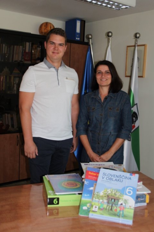 Uroš Vodopivec, predsednik OO SLS Grosuplje, in Janja Pečelin, vodja akcije Napolnimo šolsko torbo, ob predaji delovnih zvezkov[/caption]Sep 04, 2017