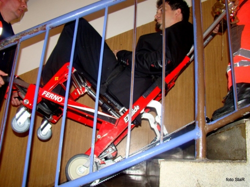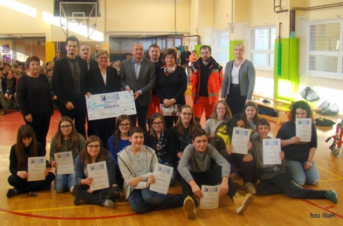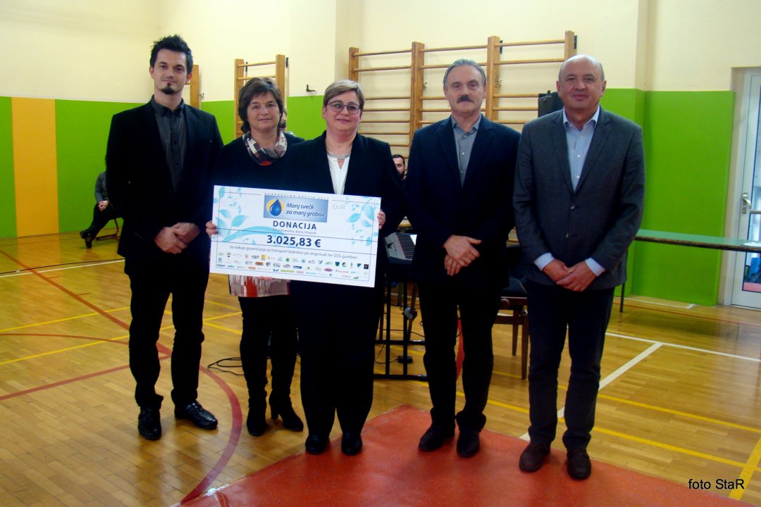 Hrastnik, 19. december 2017 – Na sprejemu, ki je potekal v Osnovni šoli narodnega heroja Rajka so preizkusili nov reševalni voziček – goseničar, kupljen s sredstvi dobrodelne akcije Manj svečk za manj grobov 2017, in ga predali v uporabo Zdravstvenemu domu Hrastnik.