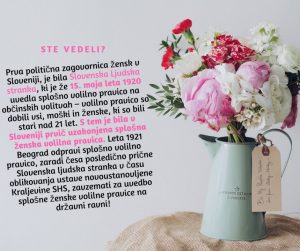 Pomembna je letnica 1906, ko je Marija Urbas kot prva Slovenka doktorirala, in sicer iz filozofije na graški univerzi. Prva politična zagovornica žensk v Sloveniji, je bila Slovenska Ljudska stranka, ki je že 15. maja leta 1920 uvedla splošno volilno pravico na občinskih volitvah – volilno pravico so dobili vsi, moški in ženske, ki so bili stari nad 21 let. S tem je bila v Sloveniji prvič uzakonjena splošna ženska volilna pravica. Leta 1921 Beograd odpravi splošno volilno pravico, zaradi česa posledično prične Slovenska ljudska stranka v času oblikovanja ustave novoustanovljene Kraljevine SHS, zavzemati za uvedbo splošne ženske volilne pravice na državni ravni!