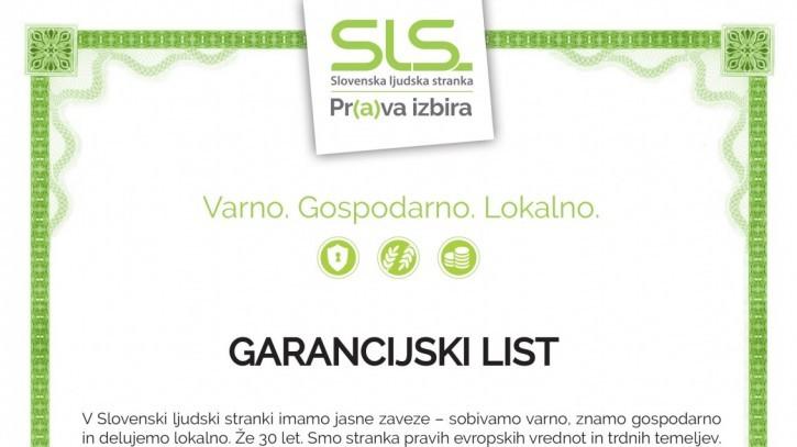 V SLS imamo jasne zaveze – sobivamo varno, znamo gospodarno in delujemo lokalno. Z dejanji in konkretnimi pozitivnimi rezultati jamčimo za slovensko kakovost. V programu smo zapisali, da bomo varovali slovenske meje, krepili pripadnost Sloveniji in terjali odgovornost politike do prihodnjih generacij. Tukaj in zdaj. S tem garancijskim listom posebne vrste SLS jamči, da je SLS garant za novo razvojno vlado v Sloveniji in da si bo do leta 2022 prizadevala uresničiti vrsto programskih točk. Garancija stopi v veljavo 3. junija 2018 in traja 4 leta.